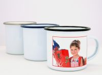 Foto-Emailletasse weiß mit farbigem Tassenrand